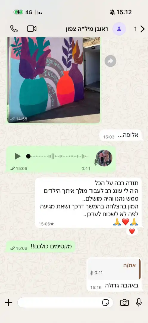 סשה יקרה! כבר 3 פרוייקטים שאת מגיעה אלינו לכפר הנוער רמת הדסה, מעבר ליצירתיות והתוצאה המהממת, פשוט תענוג לעבוד איתך! זמינה, קשובה, זורמת עם הרעיונות, מפעילה את הילידם בכיף, ונותנת את הלב והנשמה עד שהתוצאה הסופית לא פחות ממושלמת. ממליצה לכל מי שרוצה פעילות כיפית, ותוצאה מהממת שנשארת על הקיר לראווה. ברור לי שנמשיך לעבוד יחד וזו הזדמנות לומר לך תודה רבה!😍
