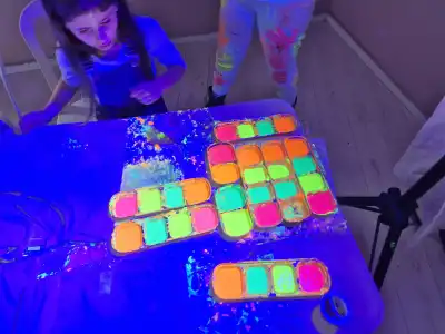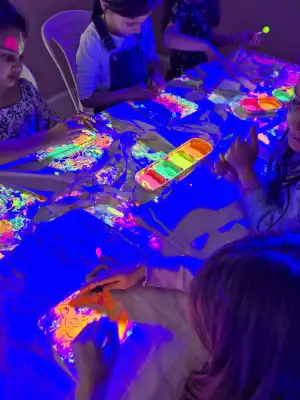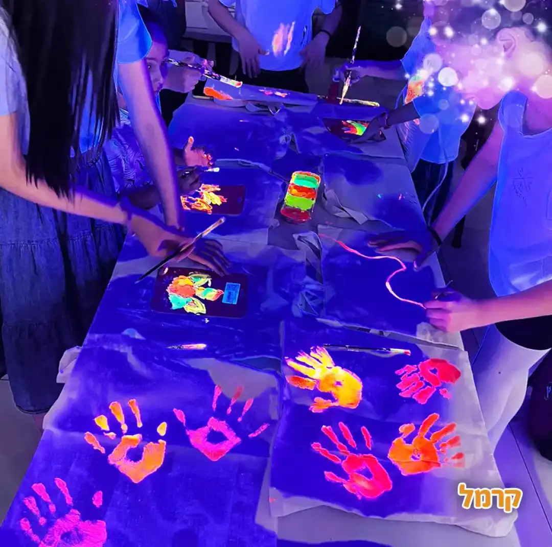 כל מה שאתם ההורים צריכים זה שולחן לכל הילדים וחלל חשוך, ככל שיהיה יותר חושך כך נוכל להנות יותר מהתאורה של האולטרה סגול [פולמון]