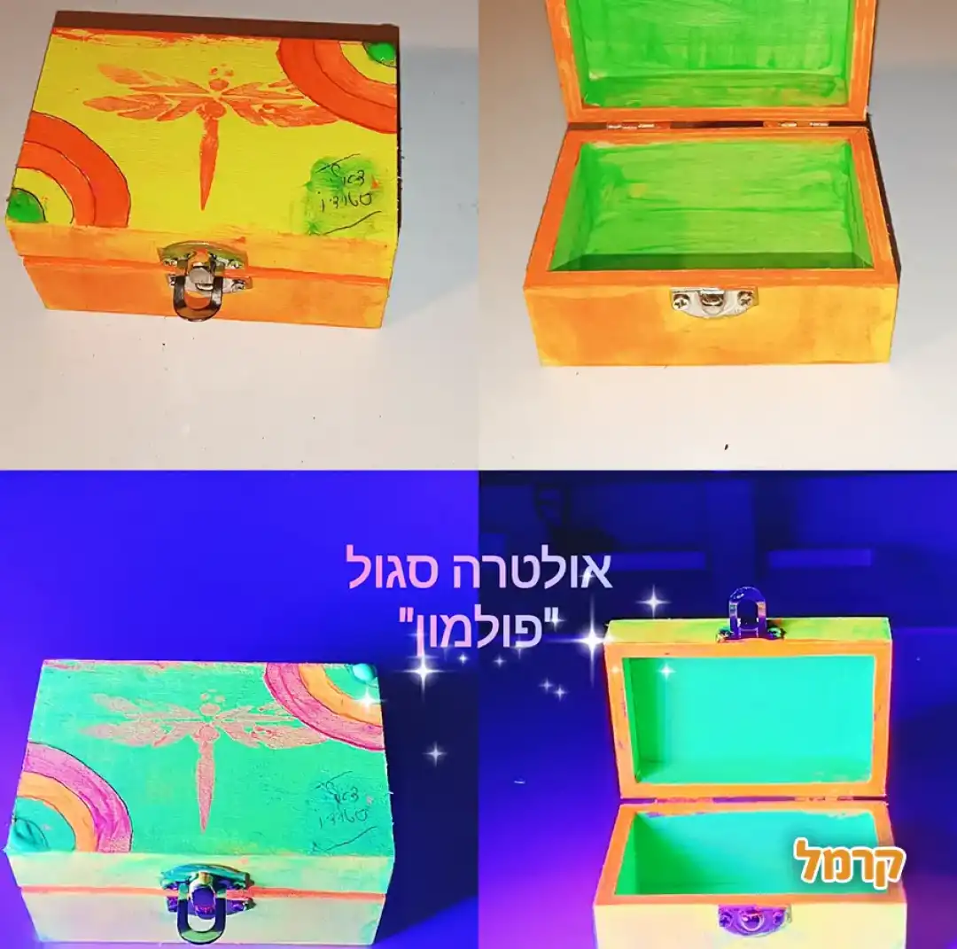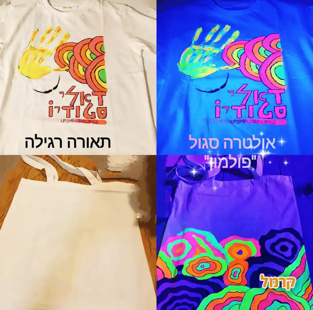 חלק הראשון - החלק של היצירה, נבחר את סוג היצירה שנרצה לעשות יש הסבר קליל, הצבעים סופר מגיבים לתאורה של האולטרה סגול מה שעושה את היצירה זוהרת וחוויתית