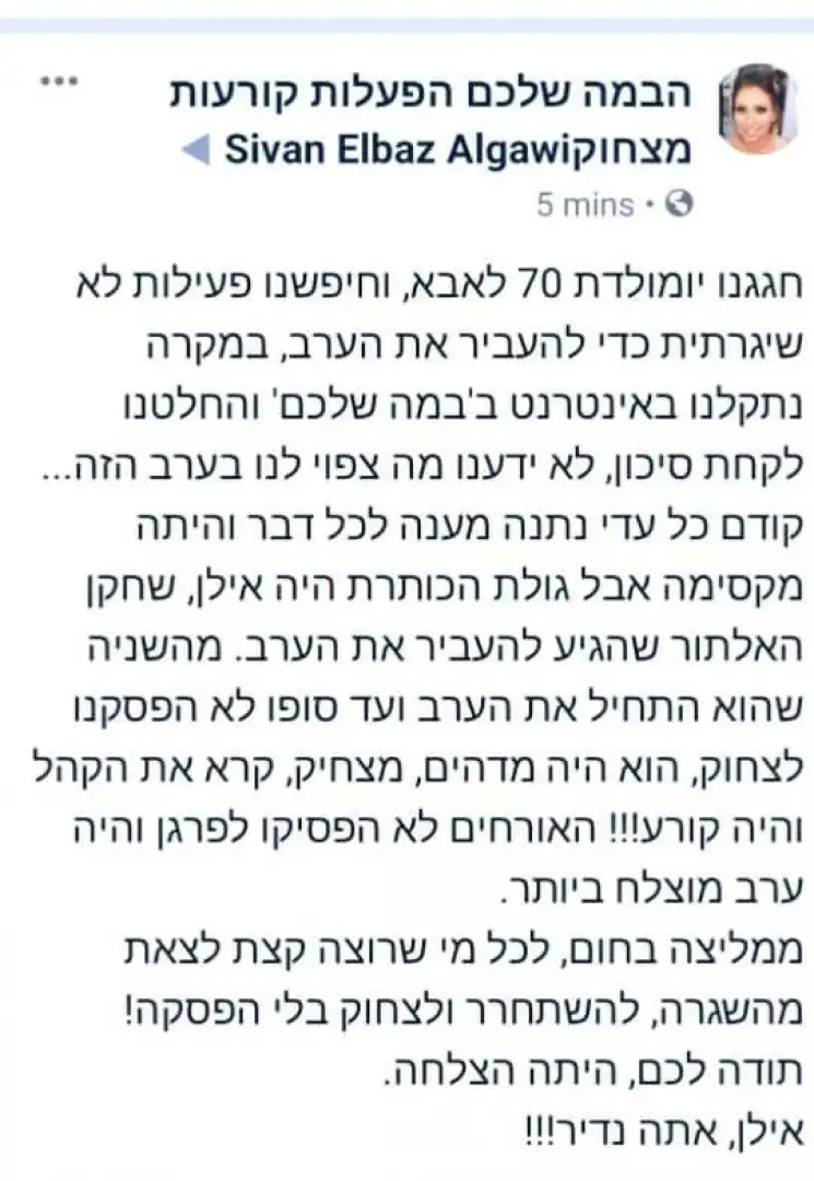 הבטן שלנו כאבה מרוב צחוק! הרבה בזמן לא נהננו כך. תודה ענקית על יום הולדת מושלמת עם כל בני משפחתנו. אוהבים, משפחת ירדני מתל אביב