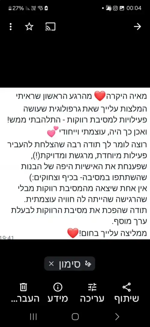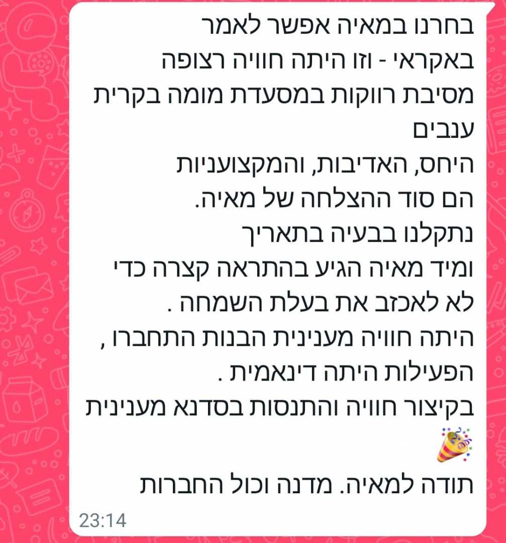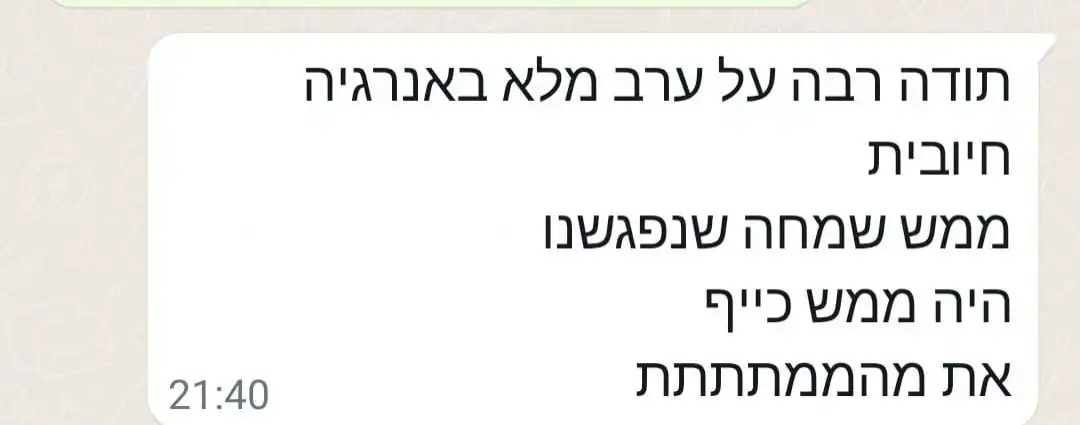 מאיה היקרה ❤️ רצינו לומר לך תודה גדולה על ערב חוויתי, מלמד,משעשע, מגבש, קצת אחר ומלכד את כולם סביב. היו כאלה שבאו חסרי אמונה ויצאו בתחושה גדולה ומעצימה. איזה כיף שזכינו ליצור את הערב הזה דווקא איתך. כמה סבלנות יש בך ונעימות רבה! כל הנאמר היה נכון ומדוייק!!! היה מושלם!!!! איך אני יודעת? כי לא הפסיקו לדבר על הנושא גם כשהלכת, השארת אחריך אבק כוכבים בשובח! שולחים חיבוק גדול,