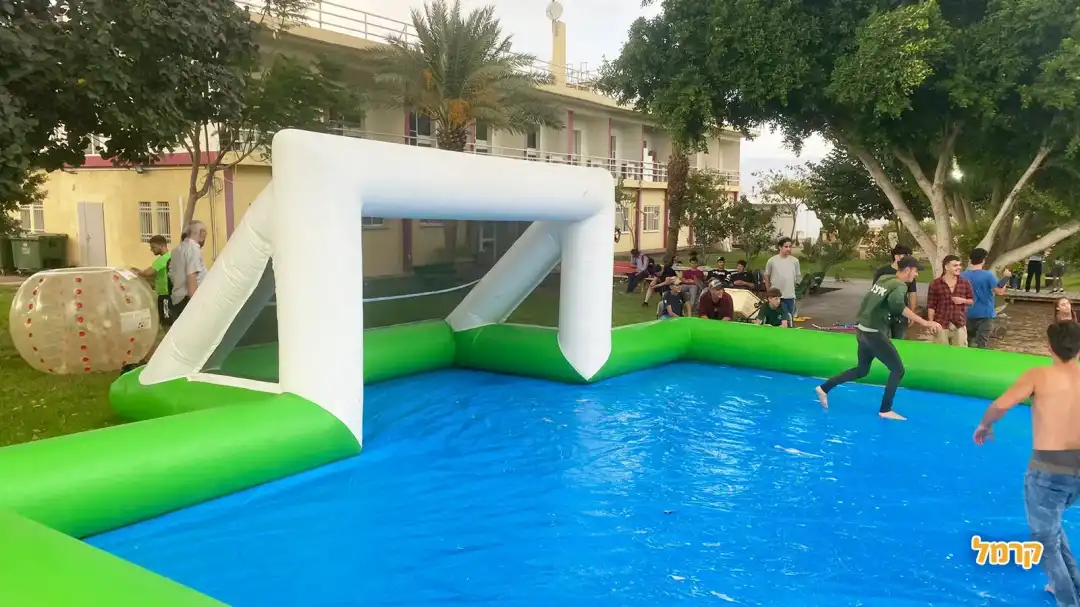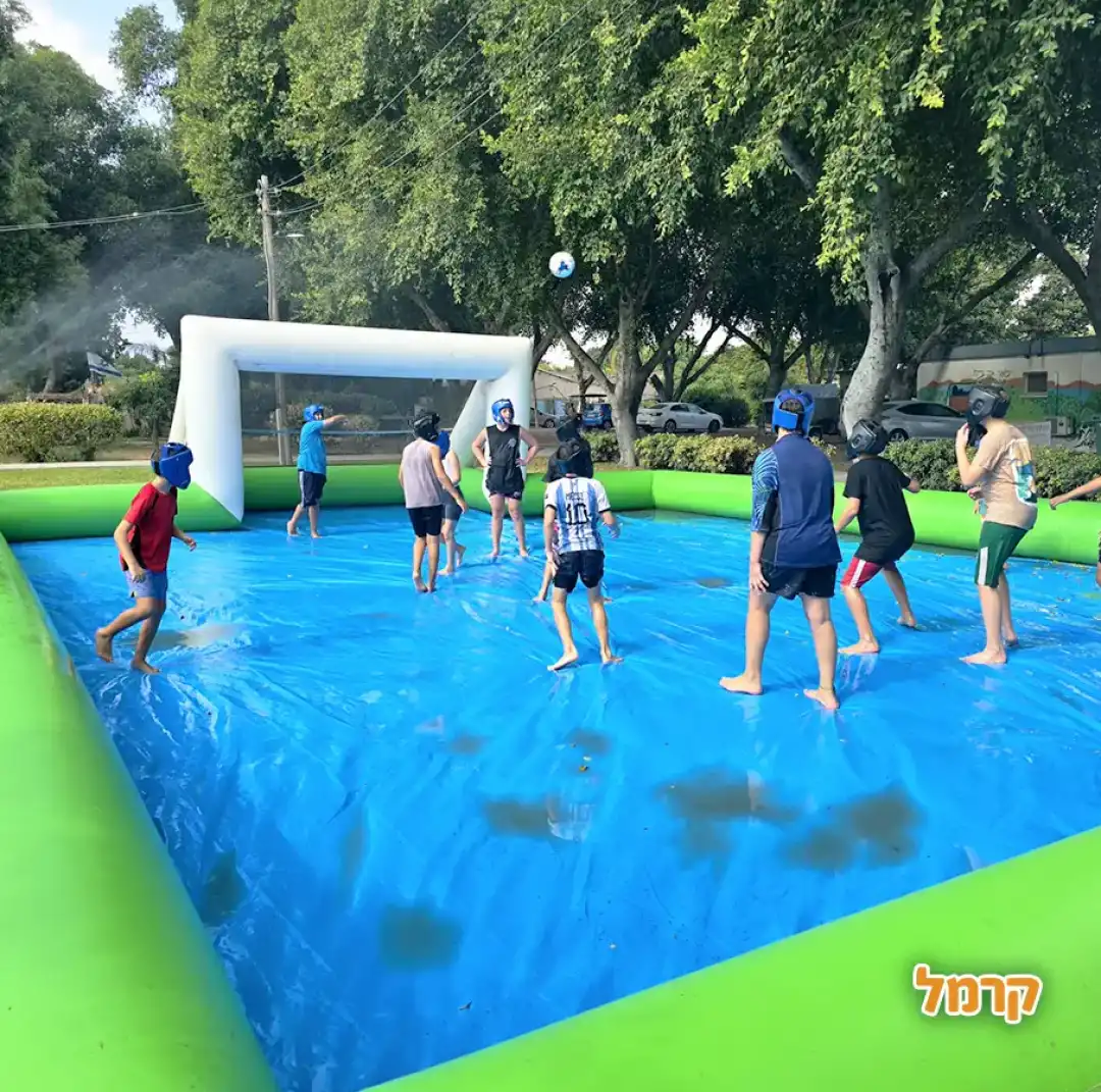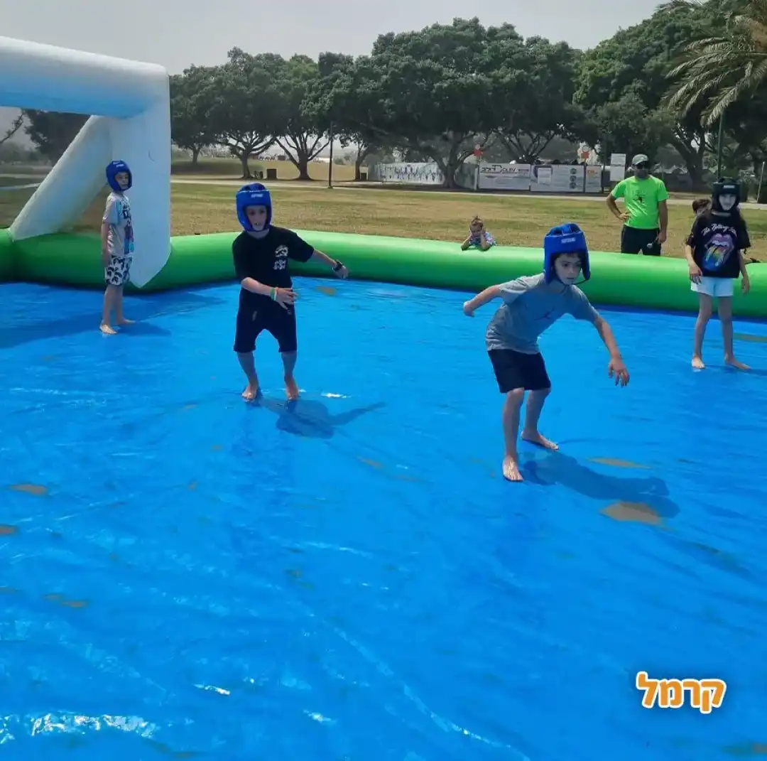 אנו נגיע אליכם כשעה לפני האירוע כדי להכין את המקום וגם להכיר אתכם, עם מתנפח כדורגל מים ענקי בגודל 16/10 מ' שיגרום לכל אחד להרגיש כמו שחקן כדורגל אמיתי על מים.