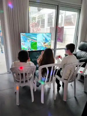 הגעה – אנו מגיעים אל המקום שבו בחרתם לחגוג שעתיים לפני תחילת האירוע ומקימים את מתחם המציאות המדומה והגיימינג הכי מטורף שאי פעם ראיתם! כמות העמדות שאנו מביאים מתאימה לכמות הילדים המוזמנים והיא מאוד מגוונת וכוללת רכבות הרים, אופנועים, זומבים ועוד הרבה דברים שילדים ממש אוהבים.