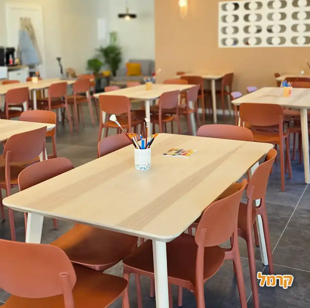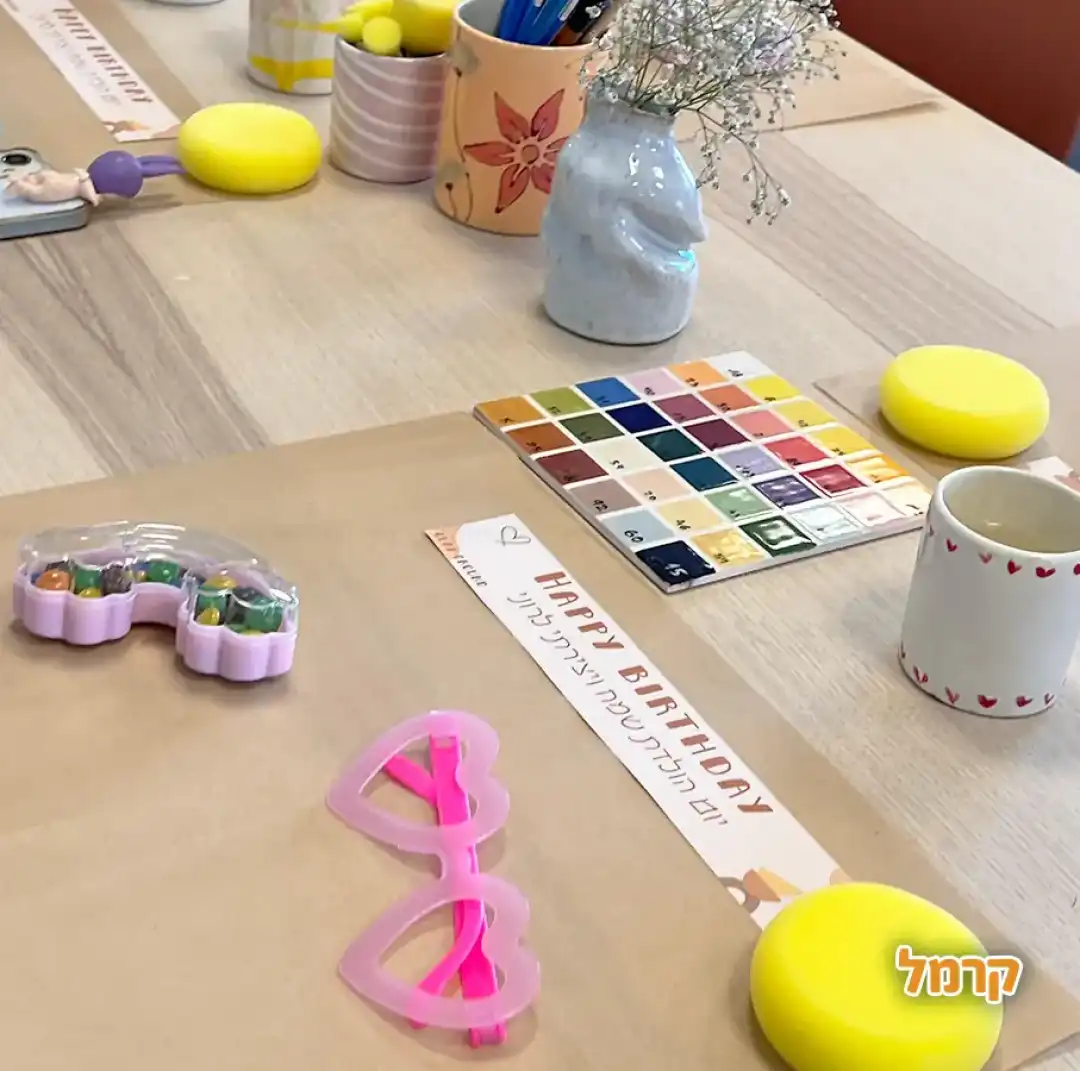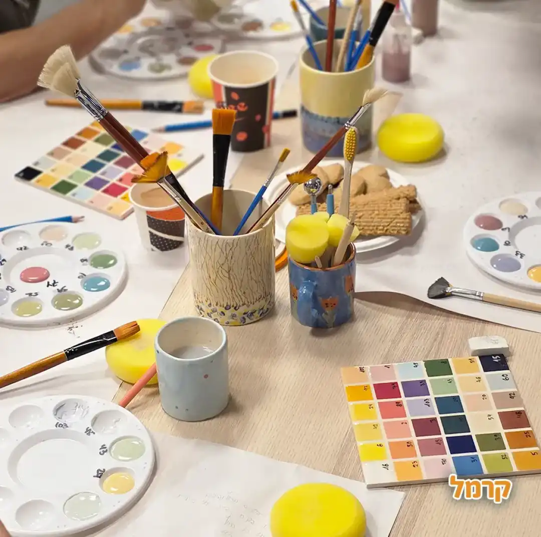 - שולחנות עם מגוון מכחולים וציוד צביעה