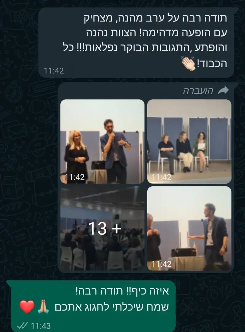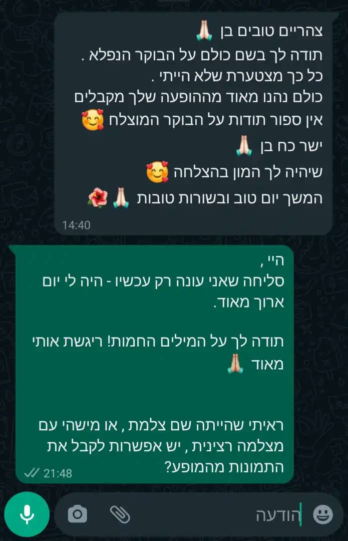 בוקר טוב בן תודה רבה על אתמול - היה אש! פידבקים מעולים מלא שאלו אותי עליך. תודה רבה על הכול היה מאוד מרשים וכיף. 🙏
