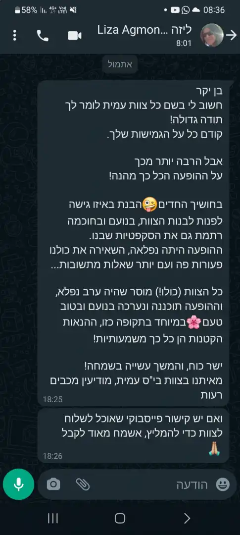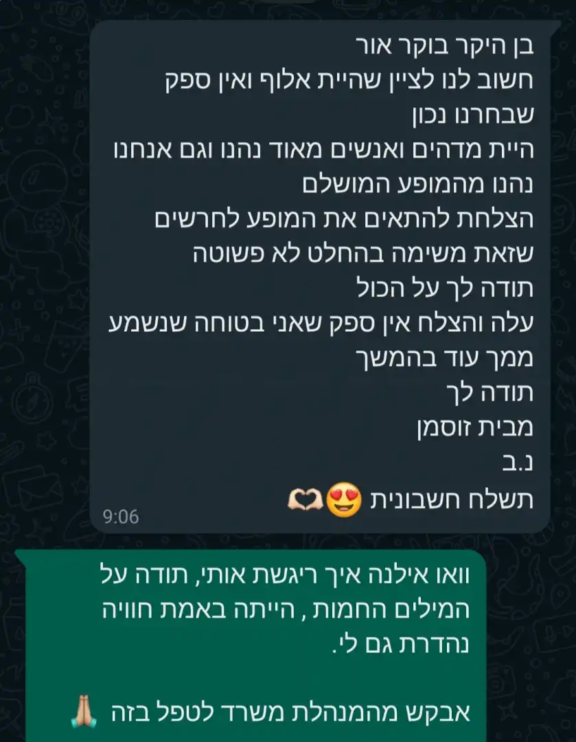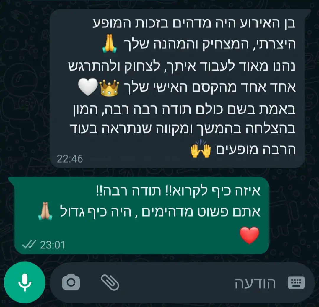 אז קודם כל תודה רבה !!!! היה מדהים. יש סרטון שהילדים רואים בלופ. עדיין לא מבינים איך נגעת באחד והשני הרגיש את זה?! 🤪😬😁 כמו שאמרתי לך עוד בשיחת הטלפון יש לך אנרגיה טובה!!! גם כשראיתי אותך הרגשתי שאני מכירה אותך. פליז אל תחשוב שאני מוזרה .. חחחחח .. אבל אני מתחברת טוב לאנשים עם אנרגיה טובה ואתה מלא באנרגיה כזאת. אתה פשוט סבלני אדיב מצחיק נעים. מודה לעצמי שהקשבתי לעצמי