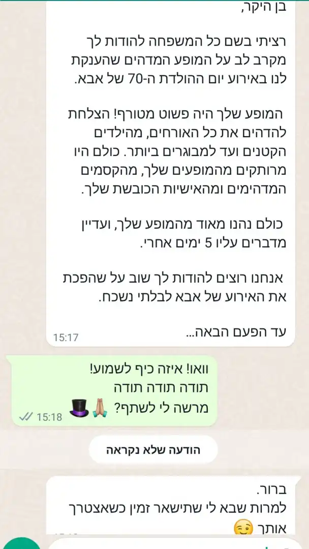 היי בן. רציתי להגיד המון המון תודה ממש הרמת את הערב !!! האורחים מאוד נהנו ובמיוחד ענבל ( שזה הכי חשוב !) המשיכו לדבר עלייך אחרי שהלכת וכל הסופ"ש העלנו כל מיני השערות לגבי איך עשית כל אחד מהאקטים. בקיצור היה מצויין מזלנו שלמרות ההתראה הקצרה הצלחת להגיע. שוב תודה ושנתראה בעוד אירועים משמחים ✌🏻🥳🙏🏼