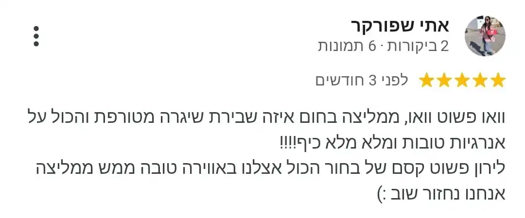 לירן היה מדהים נהנינו עד הגג. השרות שלכם מהמם ונעים. האקסטרים והנופים הסדנא המגבשת ה|'זולה|' הכיפית ומפנקת... כל הצוות נהנה ללא יוצאת מן הכלל. מעריכה את הכל ומודה מכל הלב!!!! תצליחו בענק!!!