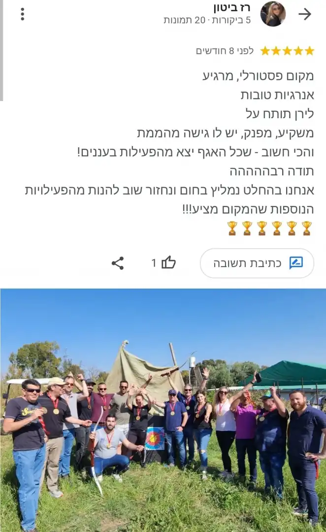 מקום פסטורלי מרגיע אנרגיות טובות לירן תותח על משקיע מפנק יש לו גישה מהממת והכי חשוב - שכל האגף יצא מהפעילות בעננים! תודה רבההההה אנחנו בהחלט נמליץ בחום ונחזור שוב להנות מהפעילויות הנוספות שהמקום מציע!!! 🏆🏆🏆🏆🏆🏆