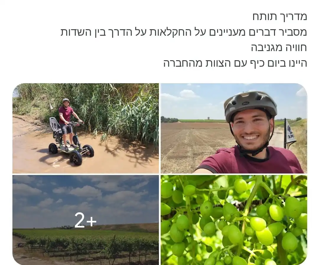 1. טיולי איזיריידר - כלי שטח חשמלי, בטיחותי ויציב המתאים מאוד לטבע לטיולים מלאי אדרנלין. המסלול עובר בין כרמים, עצי הדרים, יערות, אזורי חקלאות, ומעיינות. נעשה עצירה לטעימת תוצרת חקלאית ולהצטלם בנקודות תצפית מהם משקיף נוף עוצר נשימה. אתם תהנו מטיולי שטח מרתקים באווירה כיפית עם אנרגיות טובות והרבה צחוקים.