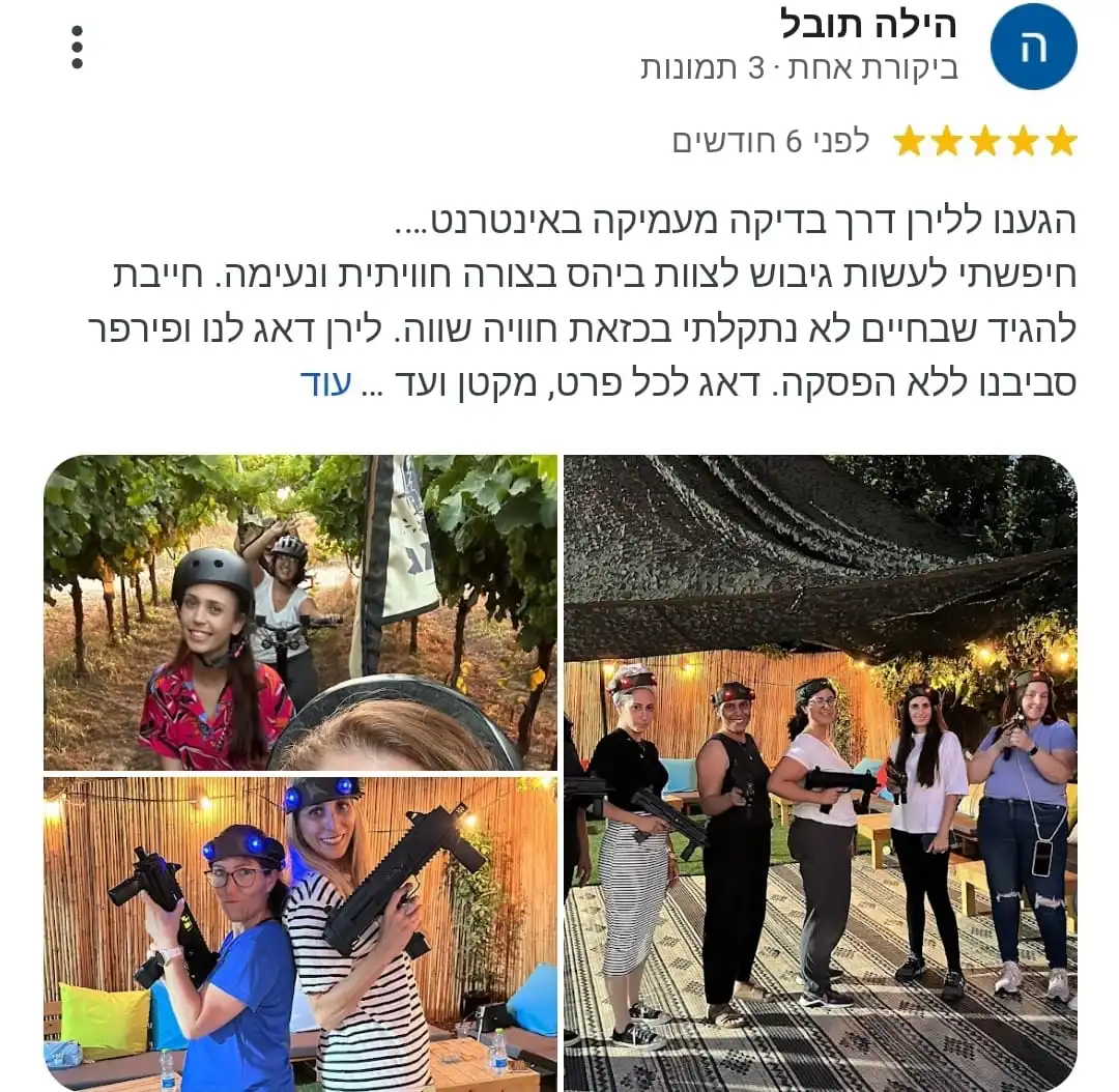 הגענו ללירן דרך בדיקה מעמיקה באינטרנט…. חיפשתי לעשות גיבוש לצוות ביהס בצורה חוויתית ונעימה. חייבת להגיד שבחיים לא נתקלתי בכזאת חוויה שווה. לירן דאג לנו ופירפר סביבנו ללא הפסקה. דאג לכל פרט מקטן ועד גדול. הריידרים שלו והטיול בכרם היו מדהיייימים!!!!! והקבלת פנים הנעימה ואפילו דאג לנו למלבי בהפתעה!! והאוכל ואו ואו. ממליצה בחום. וחברים אני לא משוחדת ואין לי שום קשר אליו. נטו פירגון טהור!