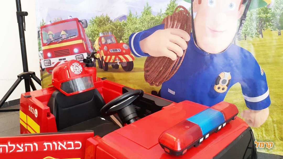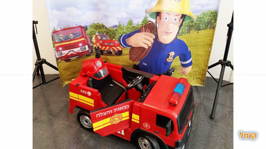 כניסה מיוחדת לחוגג בכבאית חשמלית בליווי קונפטי.