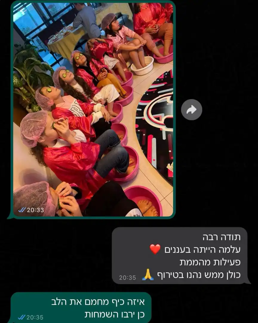 אלופת ההפעלות !!! ליידיס ספא בהחלט המקום הנכון לעשות את הילדה מאושרת . תודה על כל שנייה , לא היה רגע דל בלי שמחה ואושר