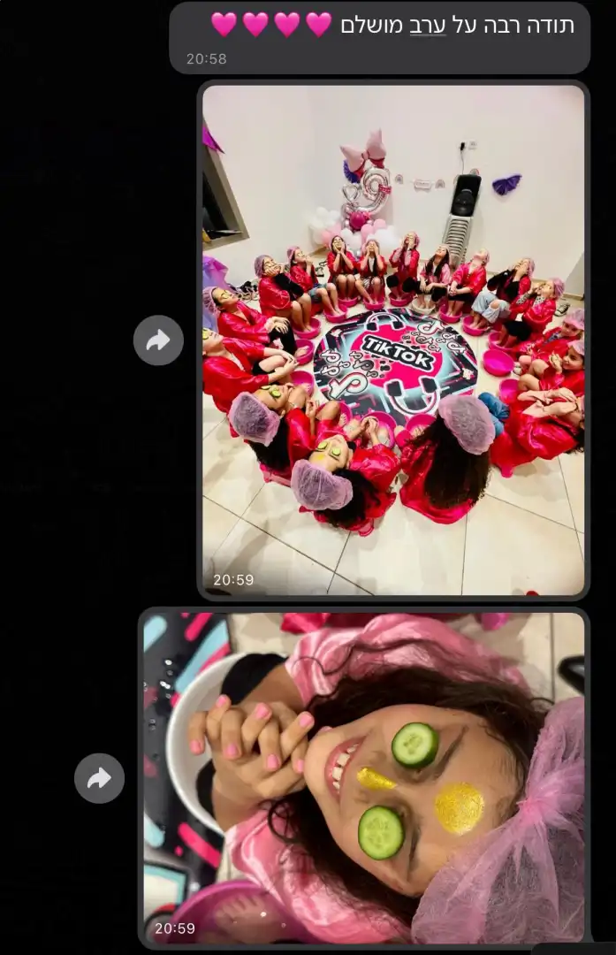 טלי והמפעילות שלה הגיעה במלוא האנרגיות הפכה את הבית תוך דקות לממלכת ספא בשילוב טיק טוק הכל היה מדהים ומושקע, הבנות לא הפסיקו לדבר על החגיגה מזכרת לנצח של יומולדת 9