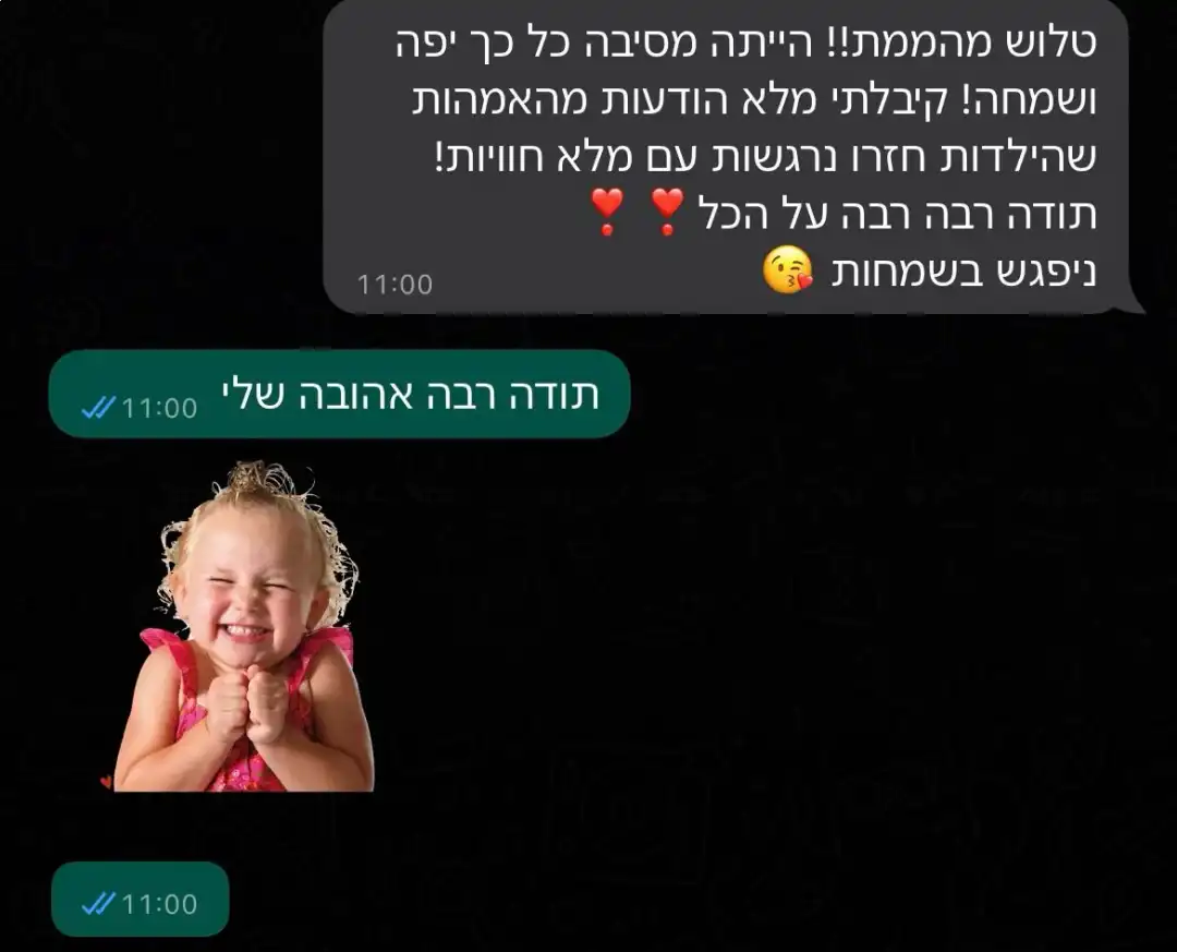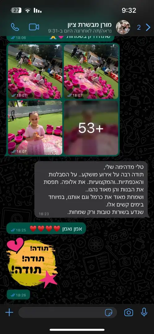 ממליצה על ההפעלה המהממת הפעלה קסומה מלאה בתוכן ודגש על ילדת היומולדת הכל היה מושלם בצורה מהממת .