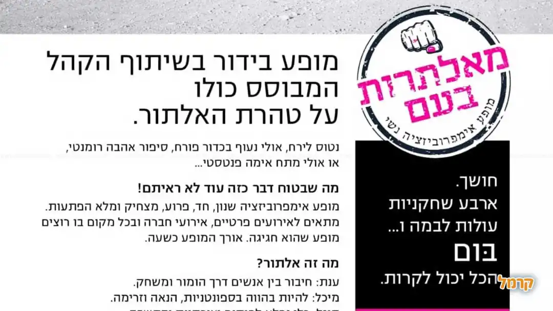 לכבוד סיגלית, סיגל, מיכל וענת – מאלתרות בעם מאלתרות בעם יקרות, רצינו להודות לכן על הופעת אילתור מקסימה ומשעשעת בפני נערות וצוות "נאות אביב". תודה שהגעתן, השקעתן, בידרתן, שיתפתן פעולה, זרמתן – יצרתן יש מאין וערב בלתי נשכח בהוסטל. הנערות נחשפו לחוויה חדשה בזכותכן, וכיף היה לראות אותן משתפות פעולה בדו שיח איתכן. רצינו להודות לכן על ההתגייסות והנדיבות, על מאור פנים ופתיחות הלב. בברכה ותודה, גפן מנור, חן איתן שץ צוות הוסטל "נאות אביב"