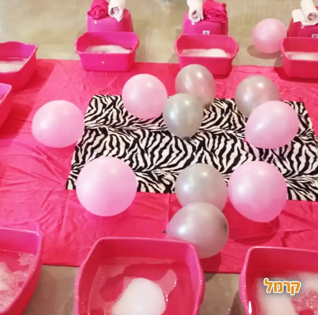 במסיבת ריקודים מטריפה עם בובת ענק, בועות סבון, שרוולי בלון ורודים ופרסים.
