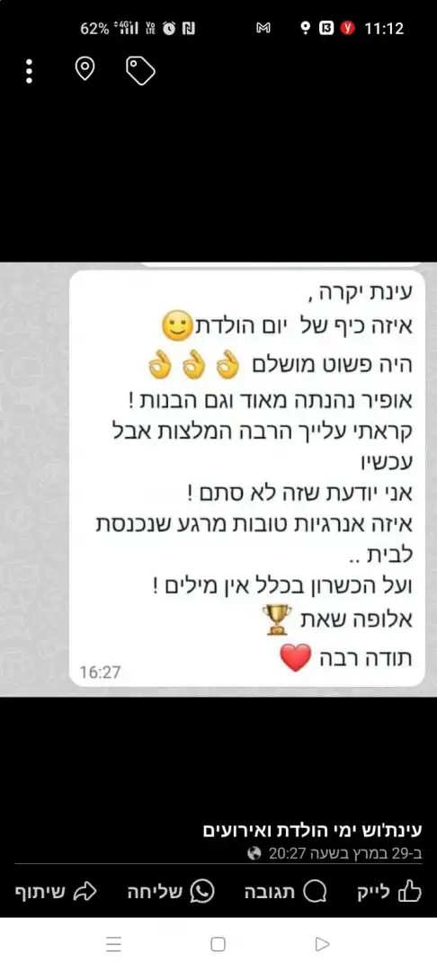 עינת יקרה , איזה כיף של יום הולדת🙂 היה פשוט מושלם 👌👌👌 אופיר נהנתה מאוד וגם הבנות ! קראתי עלייך הרבה המלצות אבל עכשיו אני יודעת שזה לא סתם ! איזה אנרגיות טובות מרגע שנכנסת לבית .. ועל הכשרון בכלל אין מילים ! אלופה שאת 🏆 תודה רבה ❤