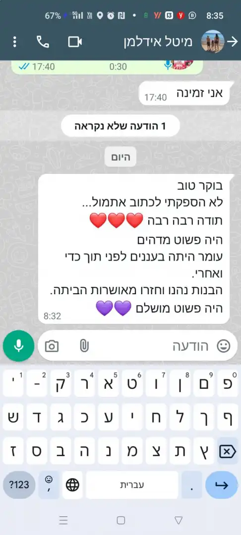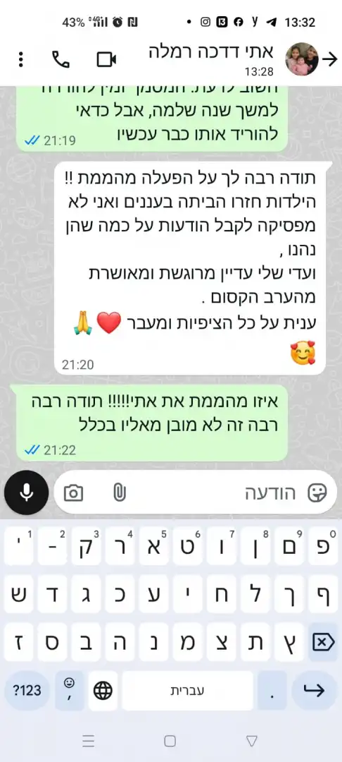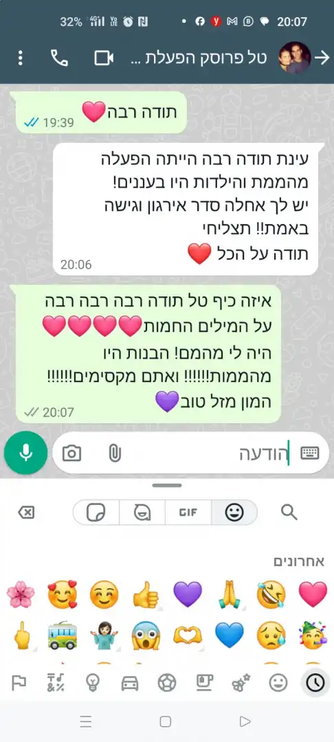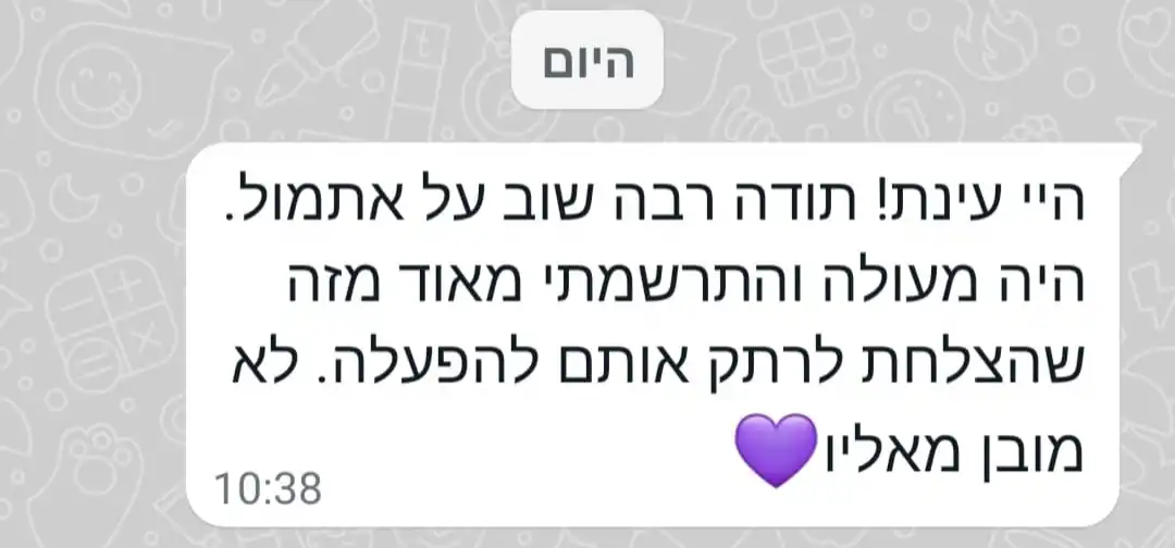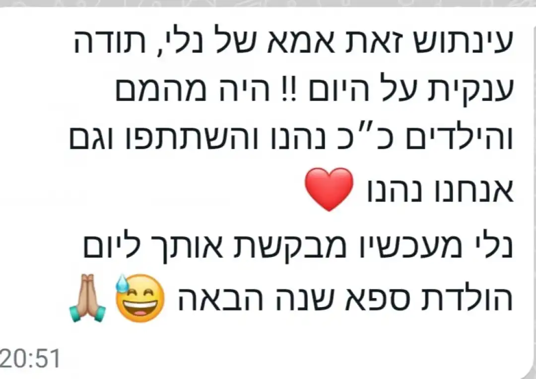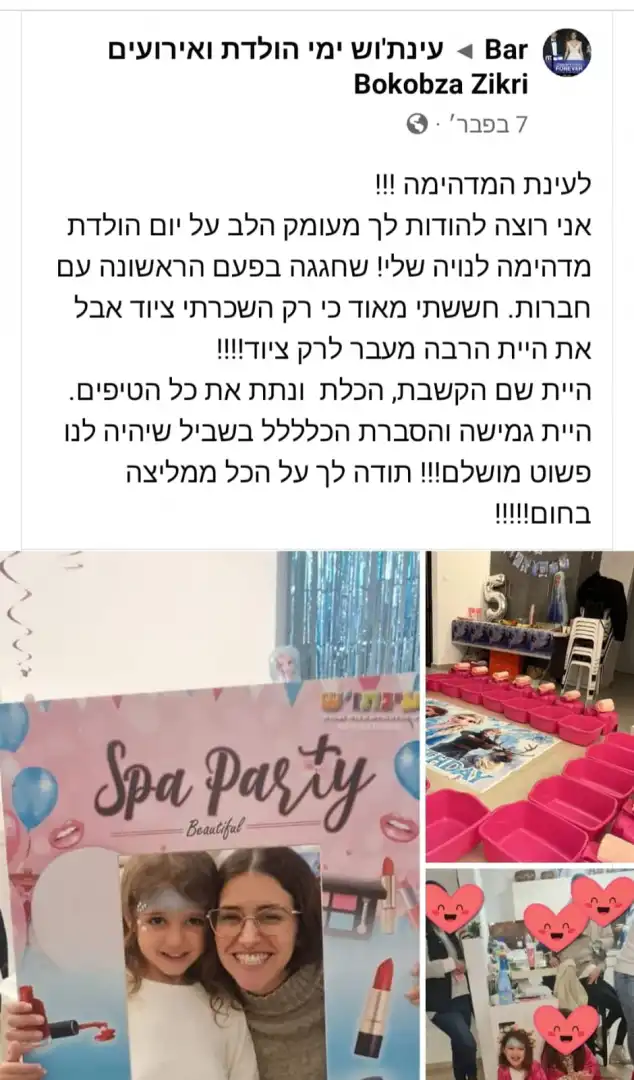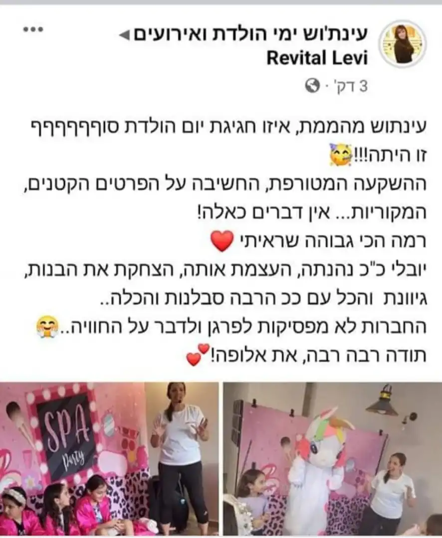 עינת היקרה תודה רבה על הפעלה מדהימה של ספא. הפעלה שהחזיקה את כל הבנות שהיו מרותקות והשתתפו. בכל חלק של הפעילות הסברת דיברת והילדים עפו עלייך. תודה רבה 🙏