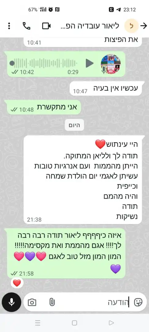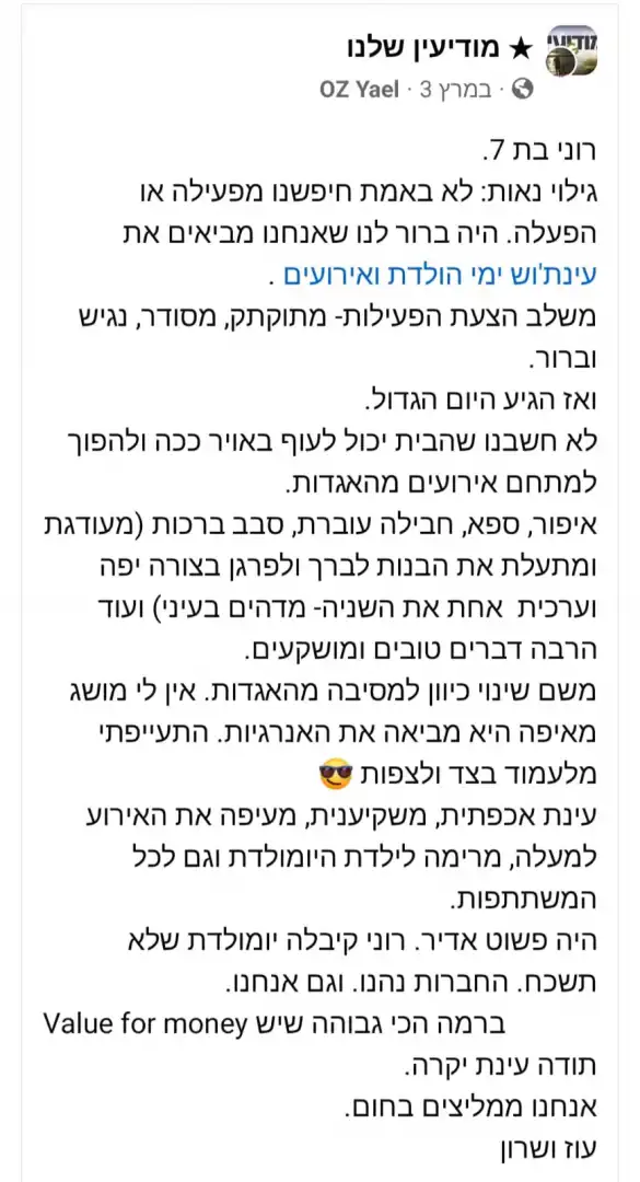 אני אתחיל בWOW אין לי מילים פשוט אין!! תודה רבה רבה הכל היה כלכך מושלם!! אופיר שלי כלכך נהנתה והיא מדברת עלייך כאילו אתן מקסימום חברות ילדות חח פעם ראשונה שהזמנתי הפעלה ליום הולדת וזאת פעם ראשונה שחגגנו ככה לאופיר ואני כלכך שמחה שזה היה איתך!! שוב תודה לך וכמובן לליאן (מקווה שזכרתי נכון את השם) המקסימה