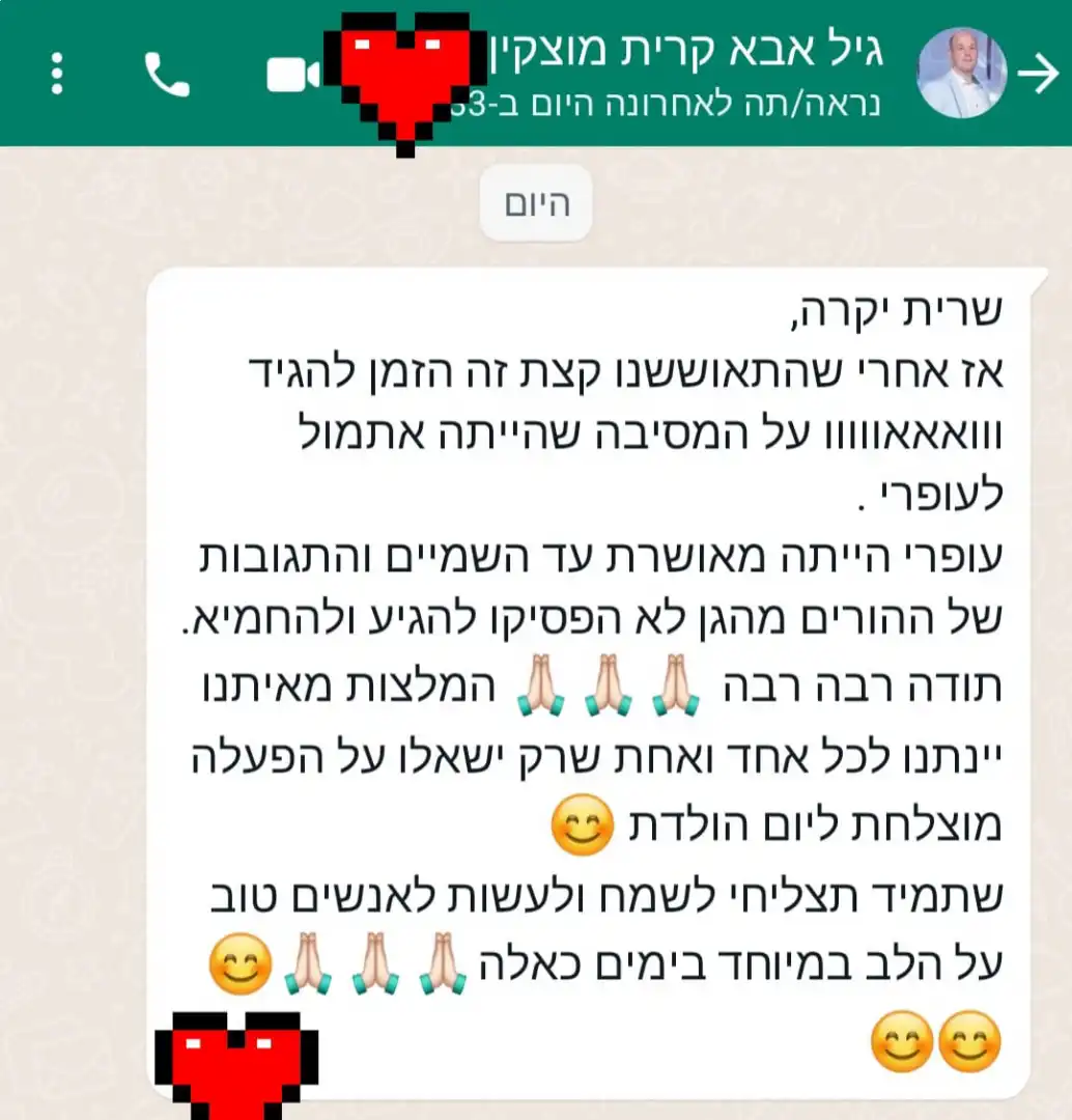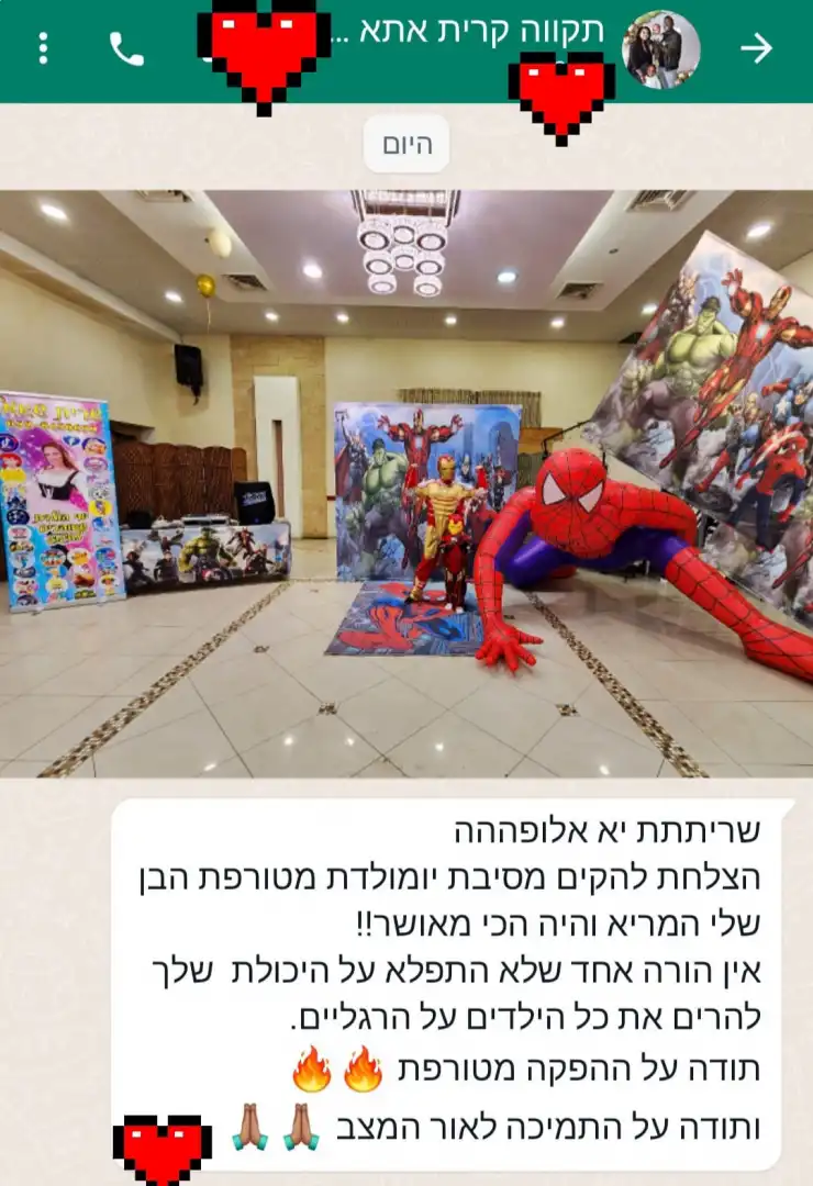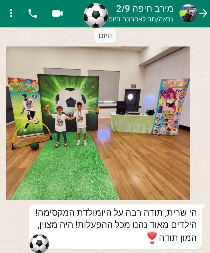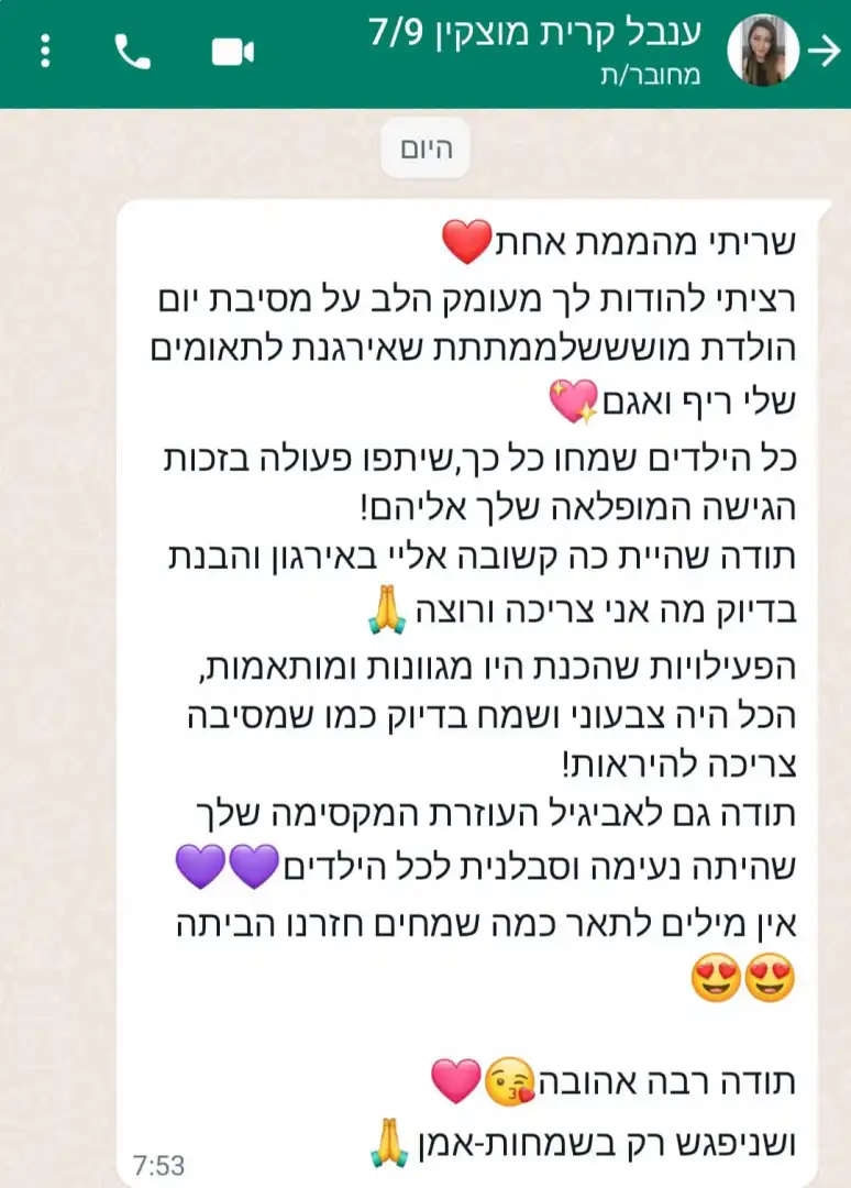 אחרי התאוששות אני כותבת לך שרית היקרה את אלופה עד עכשיו אני מקבלת מחמאות על יום הולדת מושלמת והפעלה נדירה תודה על יום הולדת כמו שתכננתי למלכה שלי תודה על זה שהילדה הרגישה מלכה כי זה היה לי הכי חשוב הילדים נהנו ממך אין עלייך נפגש בשנים הבאות בעזרת השם